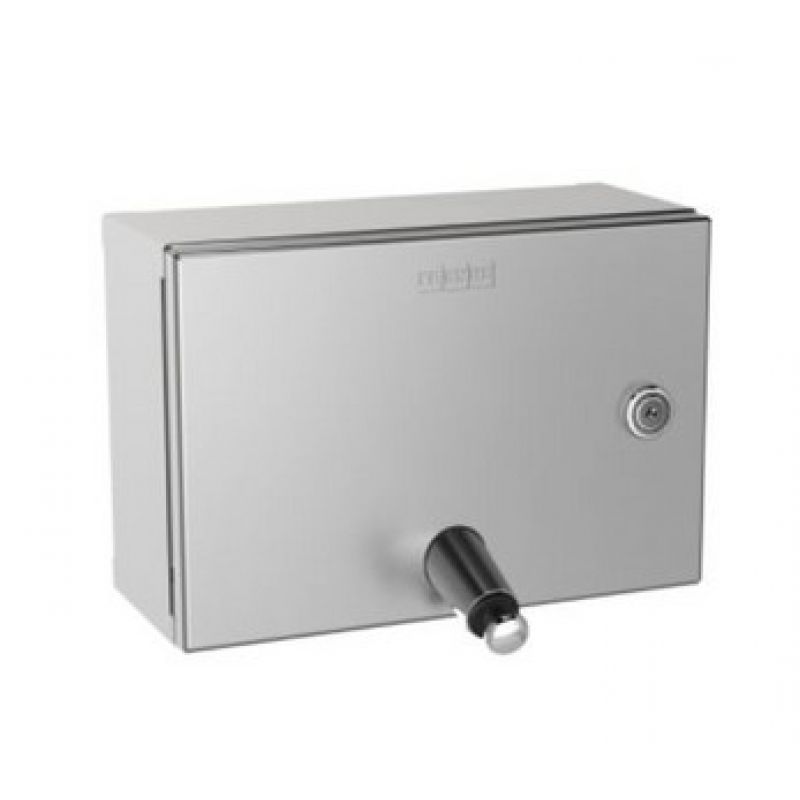 Zeepdispenser voor opbouwmontage, van roestvrij staal, oppervlak zijdemat, materiaaldikte 0,8 mm, met hoekig front, cilinderslot met Franke sleutel, met drukknop voor bediening aan voorzijde, navulbaar zeepreservoir van 1 liter, geschikt voor vloeibare zeep en lotion, inclusief roestvrijstalen schroeven en pluggen.